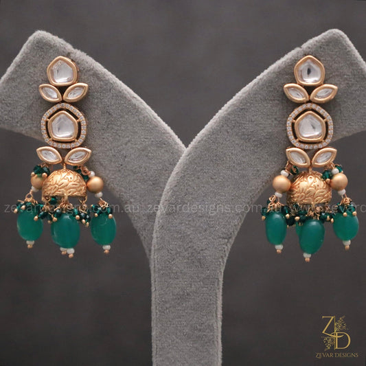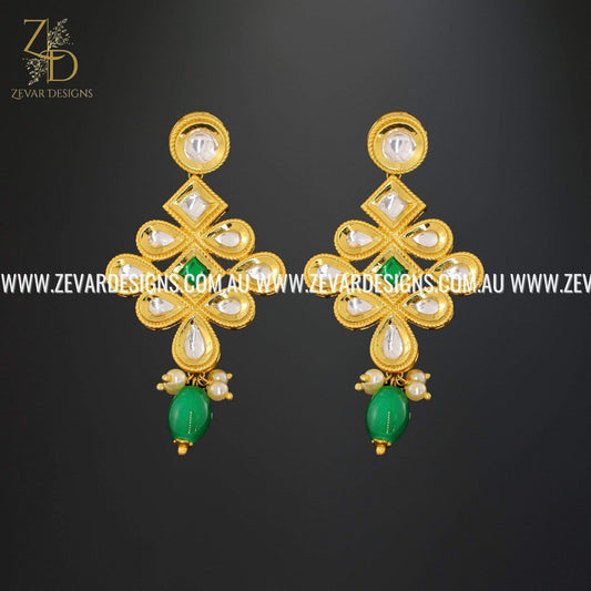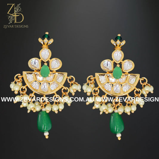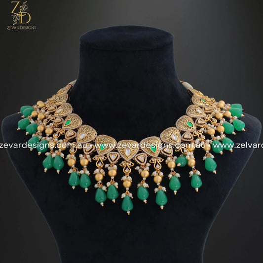 18K Gold Plated Kundan Polki Beaded Necklace Set with Pearls & Emerald green drops