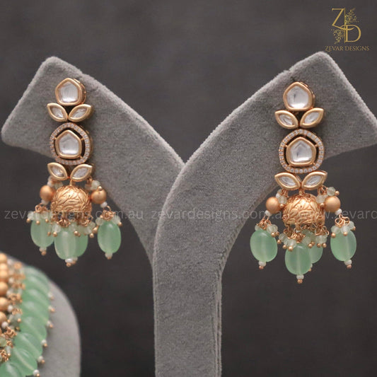 18K Gold Plated Kundan Polki Beaded Necklace Set with Pearls & Mint green drops